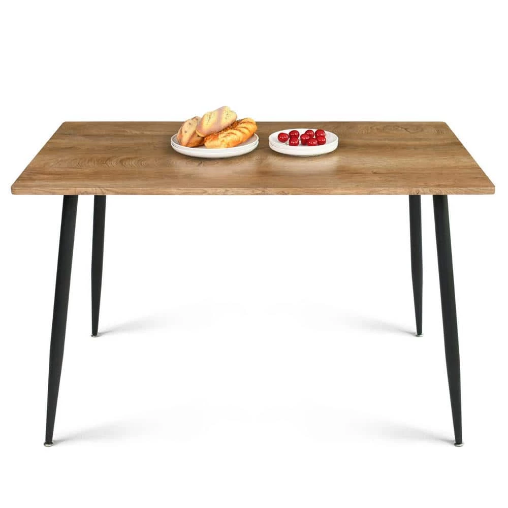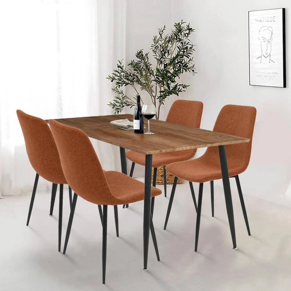 With its sleek lines and warm hues, this 5-piece dining set anchors your kitchen or dining room in mid-century modern-inspired style. It includes four chairs and a rectangular table, all perched on slender tapered legs with a black finish. The tabletop is made from kiln-dried engineered wood with natural grain variation; we love that it has rounded corners to protect you from bumps. The dining chairs are upholstered in polyester blend fabric and have armless scoop-backed silhouettes in the style of shell chairs. Plus, this set has a compact footprint that makes it an ideal pick for smaller spaces.