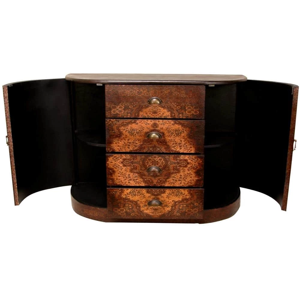 A unique, attractive four drawer credenza, with bent wood curved cabinet doors, finished with beautifully printed, wonderfully textured, faux leather. The print is a beautiful European design in subtle, muted tones against a rich dark background. Instead of “early American”, “traditional”, “French colonial”, or Mediterranean, contemporary American interior design has become a cornucopia of practical and beautiful furnishings, each home an expression of one’s own unique individual tastes.
