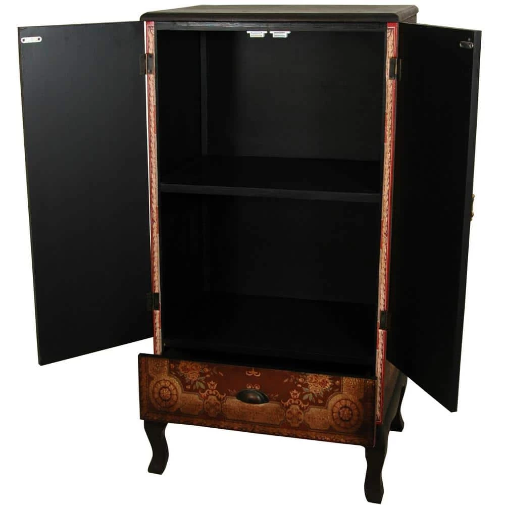 A beautiful piece of fine furniture, an attractive cabinet for a formal, traditionally decorated room, with unique design features for more eclectic home interior decor. The stunning design on the cabinet doors takes full advantage of the unique possibilities presented by the printed faux leather finish. Unique, beautiful furnishings, crafted to last a lifetime.