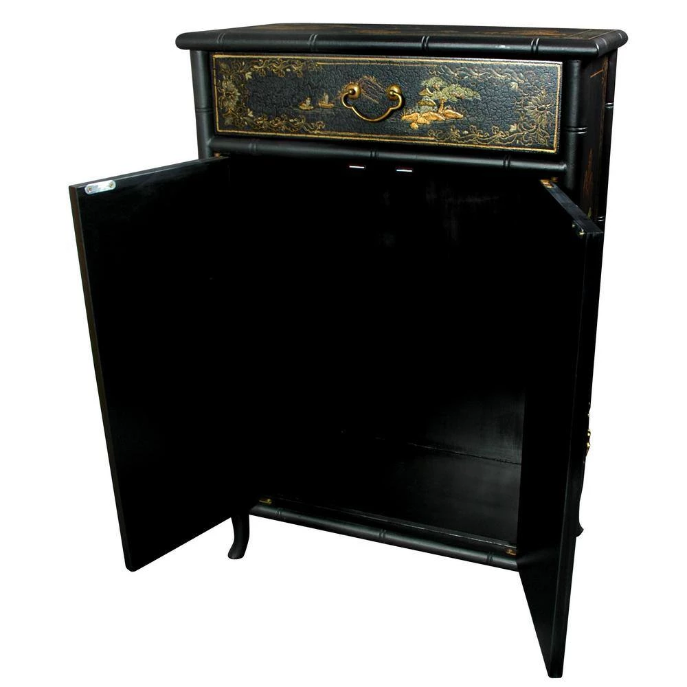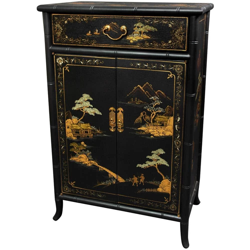 Hand-crafted by a family-owned artisans’ collective, this fine lacquer ware shoe cabinet adds practical storage space with a refined Oriental accent. Boasting a hand painted Japanese landscape across both doors and the drawer, each has been finished in a rich, traditional lacquer. A truly unique example of its craft, it is ideal for storage of shoes or other smaller accessories.