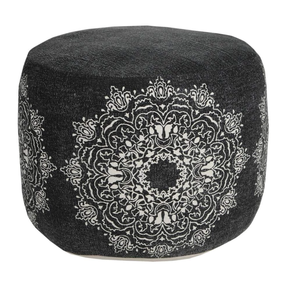 Boho Chic Mandala Medallion Pouf Ottoman, Black / White, 18 in. x 18 in. x 14 in. Providing form, function and fashion all in one charming package, this pouf features an eye-catching medallion design to go with any style from contemporary to transitional to boho. Combining a classic stonewash distressed black backdrop with an all-around mandala motif, this design brings balanced energy into your space. Easily tucked away or toted to another room in your home, use this all-in-one object as an additional seat, footrest, stool, ottoman, side table or just stylish decor. The possibilities are endless.