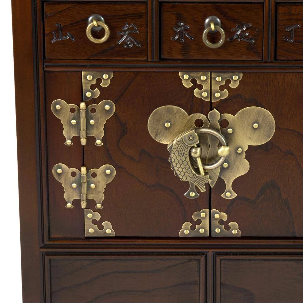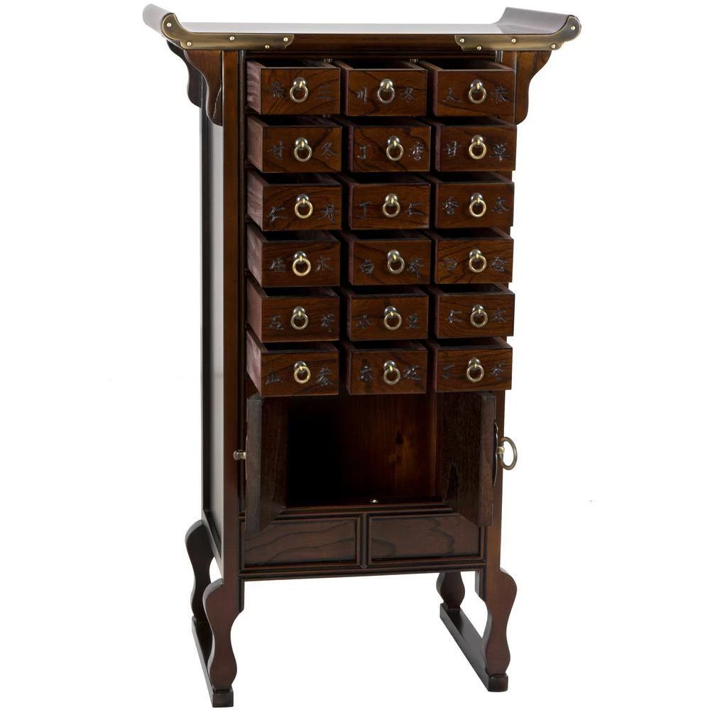 Exceptional quality hand crafted oriental style apothecary cabinet with 18 small drawers originally used for storing Chinese herbal medicine and acupuncture. A distinctive Asian decorative accent in authentic Korean / Japanese antique design. Compliments both traditional and contemporary American interiors.