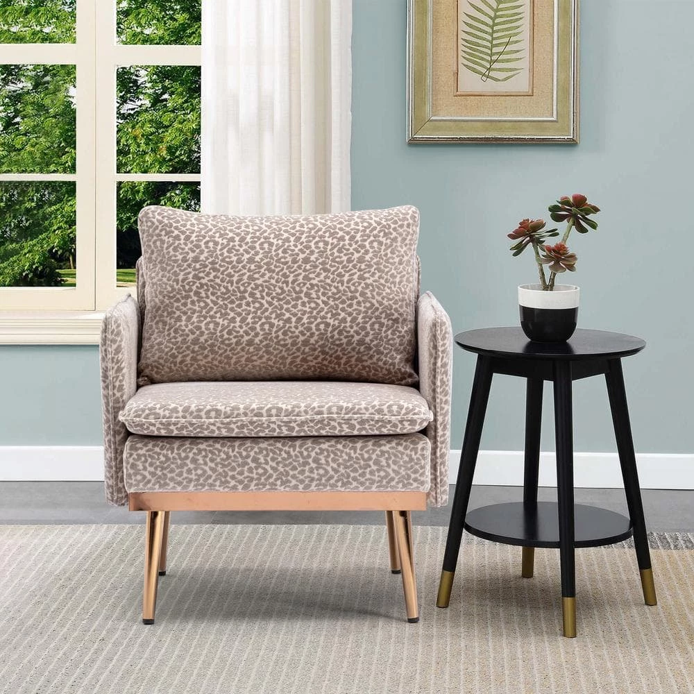 Make your living room, lounge, or waiting room more comfortable with the HOMEFUN Velvet Upholstered Accent Chair. This chair has a seat that’s both wide and deep, padded generously with thick foam. Elegant velvet upholsters the seat, deeply tufted. This chair is constructed with a sturdy metal frame in a golden finish for a chic modern look. Have fun with your space with our quirky, fashionable accent chair.