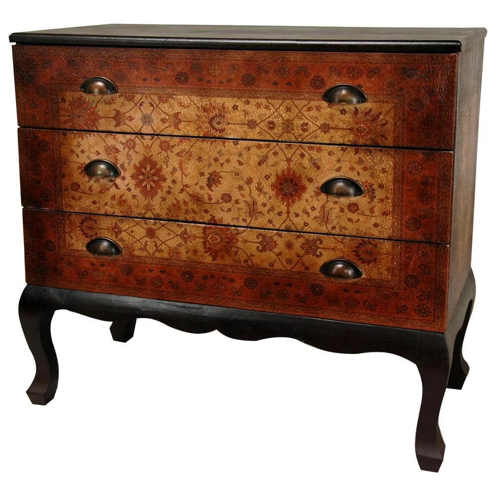 A simple, beautifully designed and proportioned three drawer chest, with elegant Queen Ann style carved legs and apron, complimenting the lovely, European design faux leather finish. The drawer fronts are decorated with subtle, muted colors in an attractive old world design, attractively accented by unique, distinctive drawer pulls. The size and shape as well as the elegant finish have made this a particularly popular design. A great hall chest, a small server, a large end table or night stand, or a lovely accent cabinet in a living or family room.
