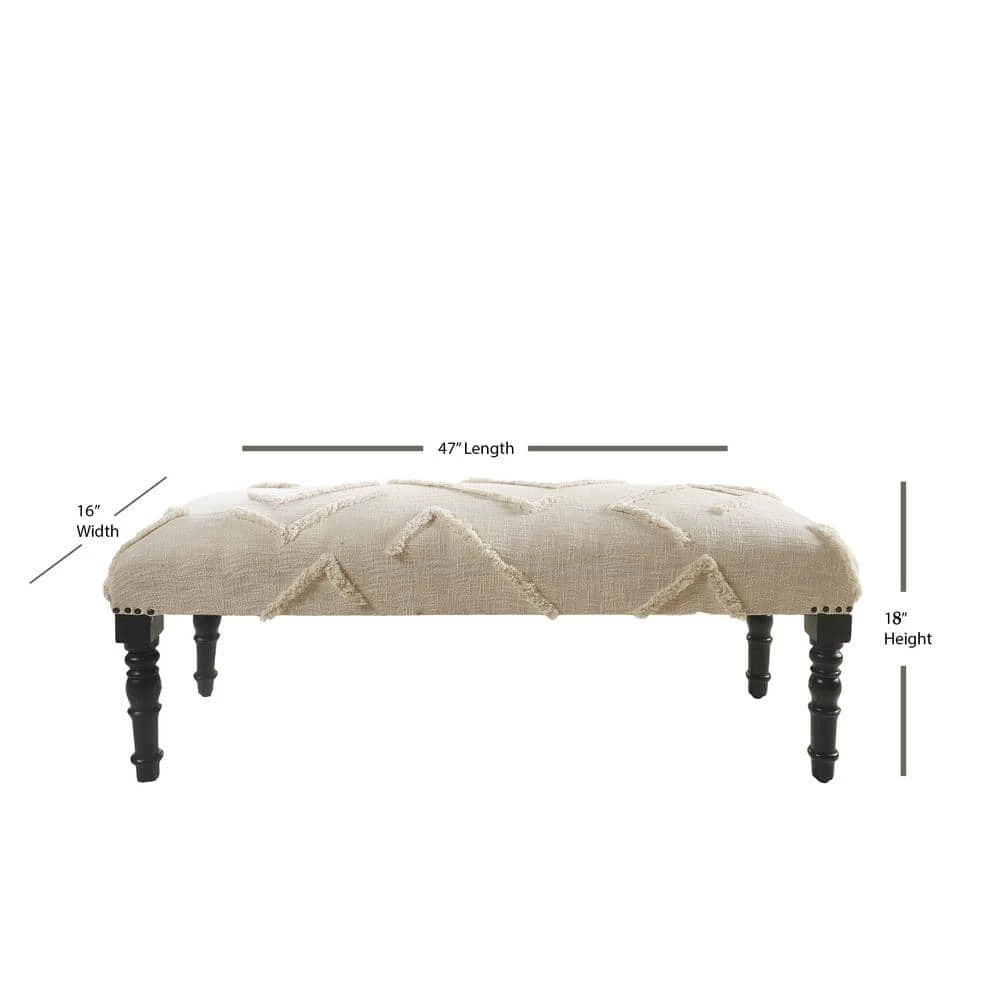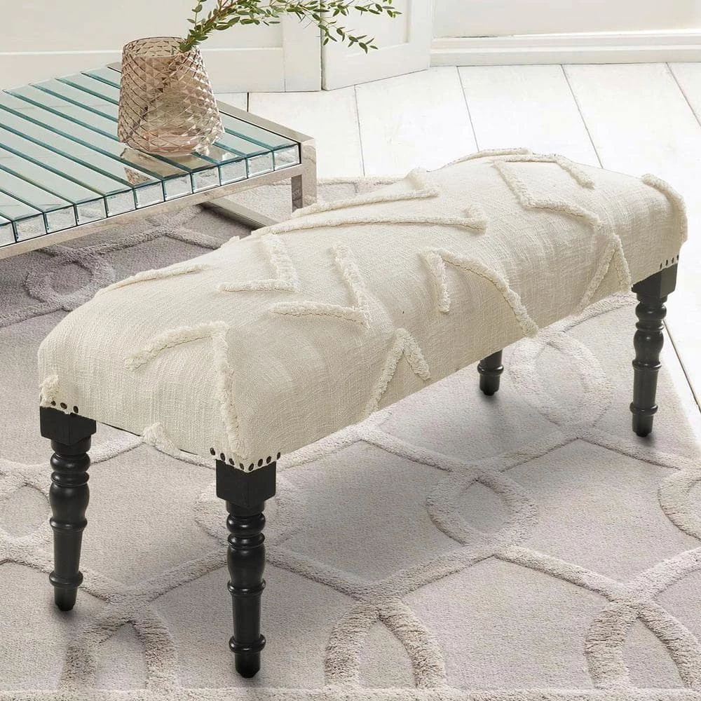 Overtufted Cream Indoor Bench : Simplicity is never going out of style. This solid, over-tufted piece is the perfect combination of style and comfort. This piece can be easily added to a foyer, living area, or waiting room in an office. You can never have too much seating in your home so bring this lovely piece home today. The tufted appearance adds a wonderful texture to your home, too. This product features a beautiful pattern, stylish legs, and quality workmanship that adds some well deserved charm and style to your home.