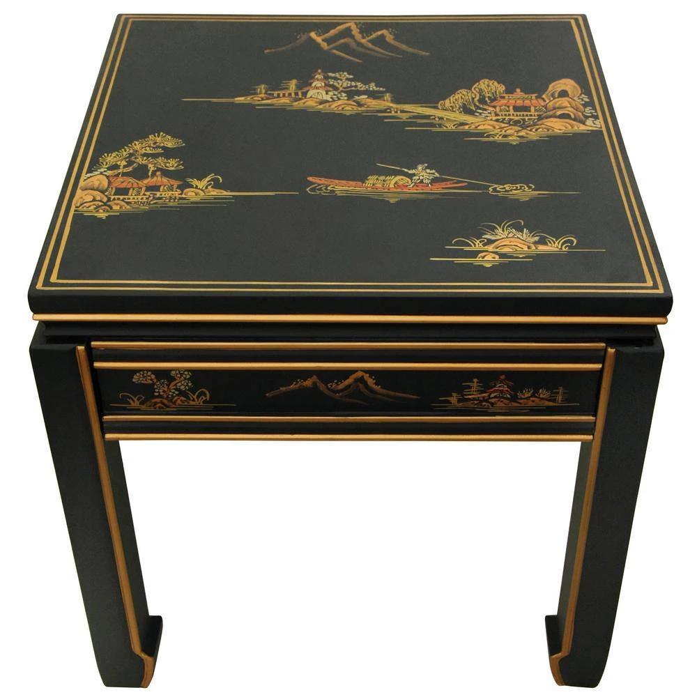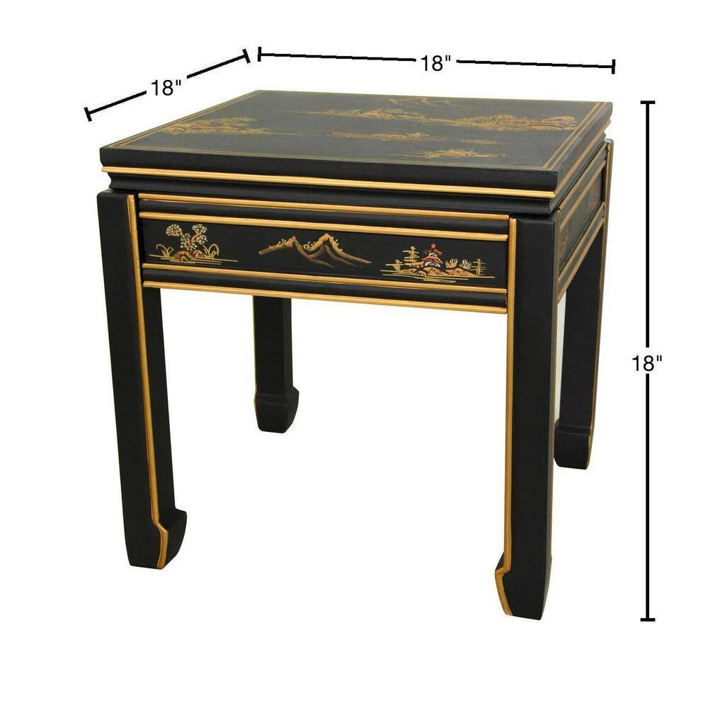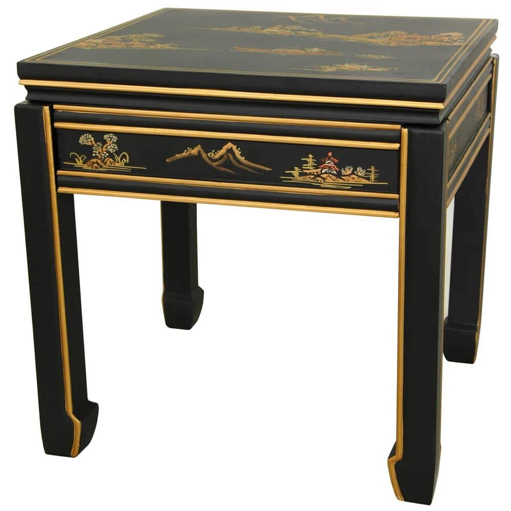 A simple, beautiful piece of fine furniture, this Ming table was hand crafted from solid kiln dried spruce. The finish is an exceptional twelve coat hard black lacquer finish, with a lovely medium gloss shine. Each piece is crafted in a small workshop in southern China and individually hand-painted with Oriental landscape motifs. This is a fine choice for adding an elegant, subtle Eastern accent to your home or office.