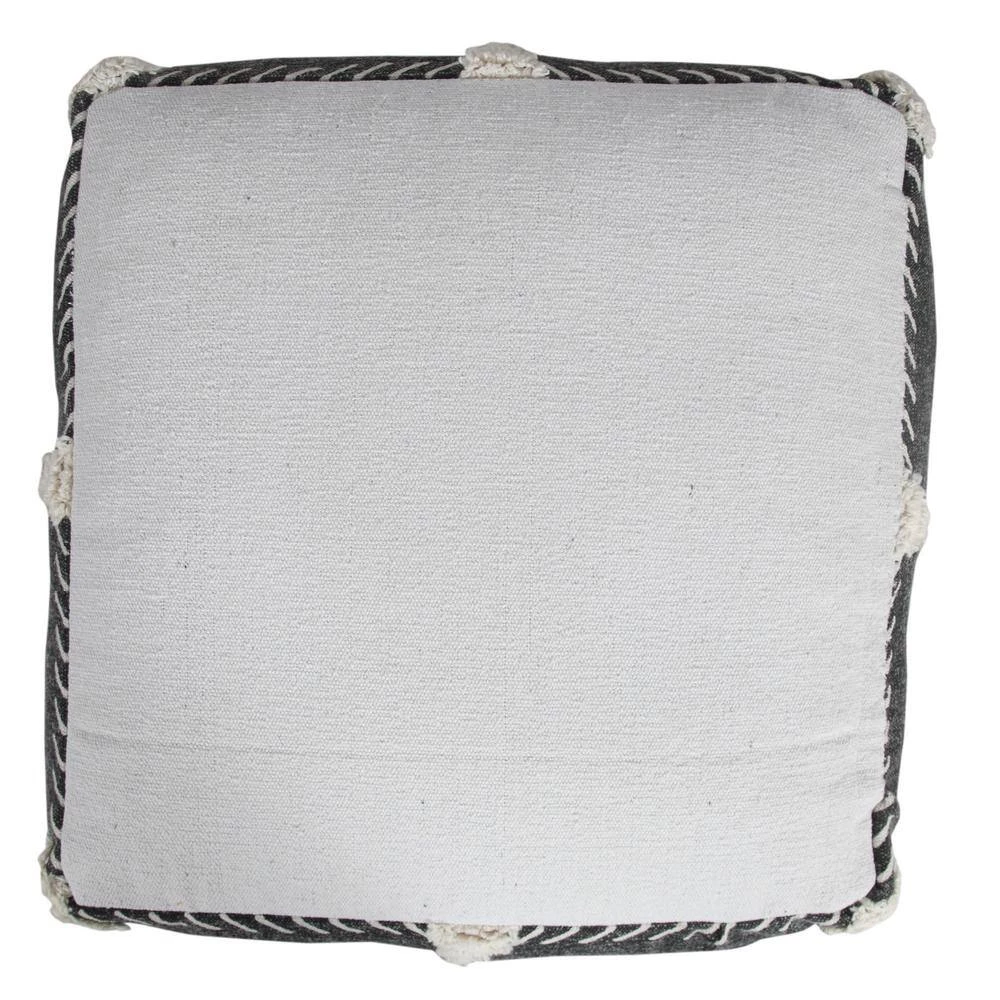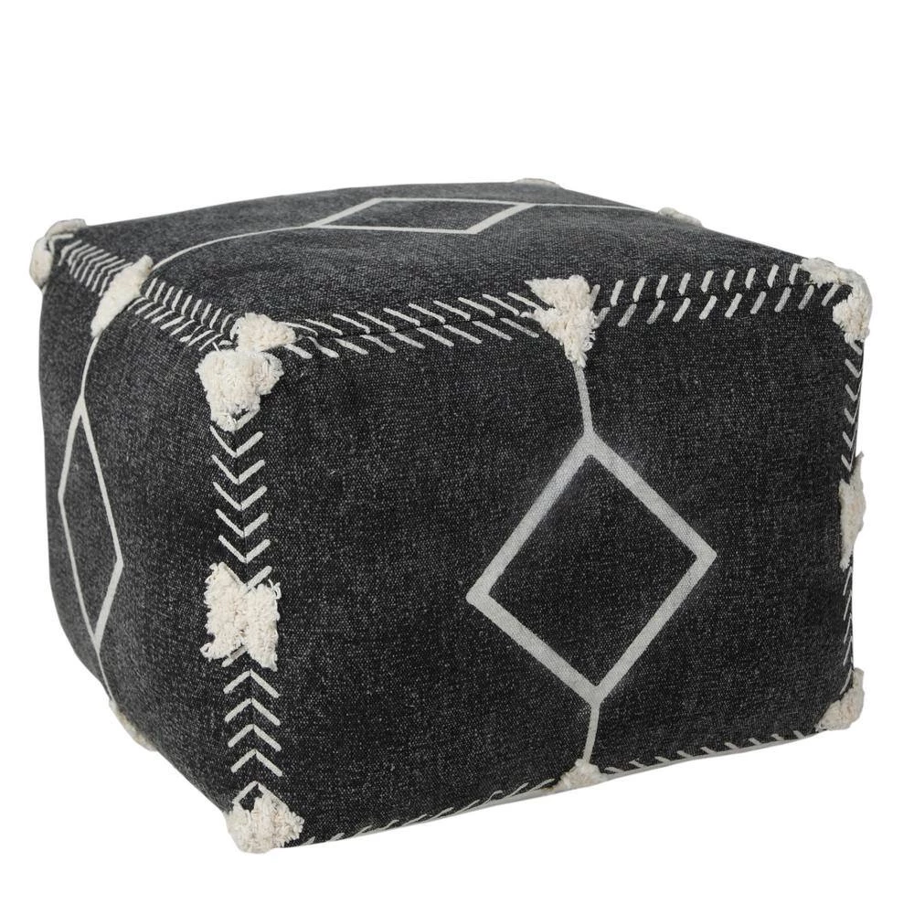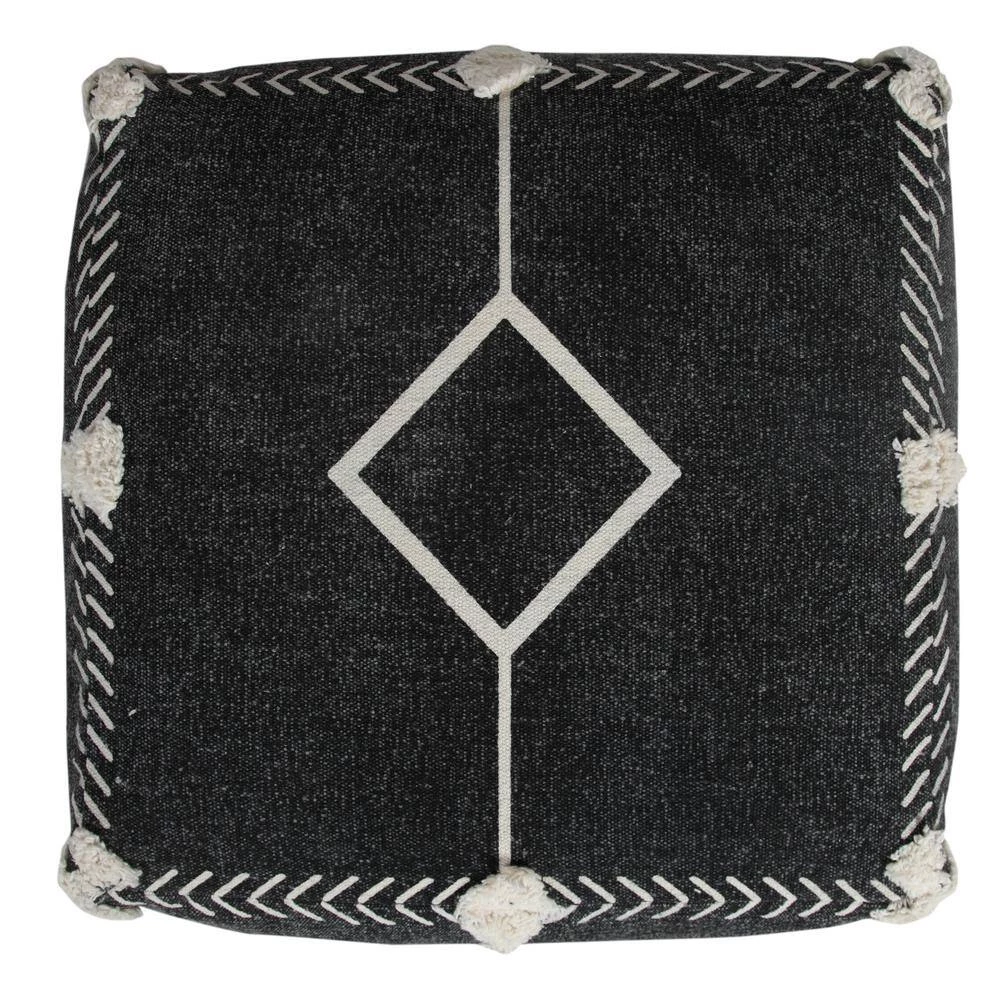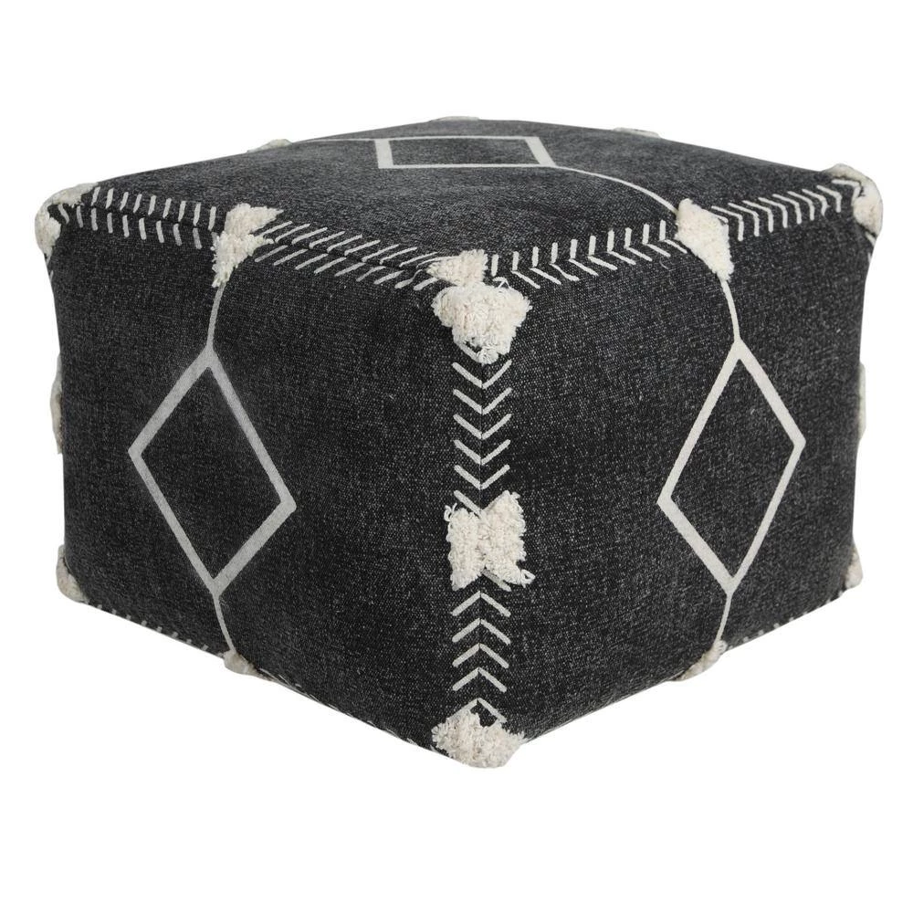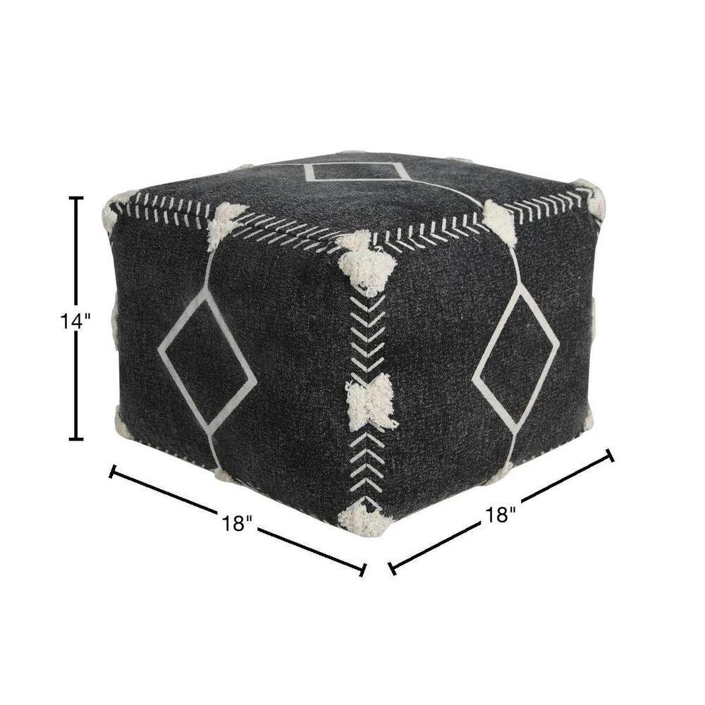 Textured Diamond Dash Pouf Ottoman, Black / White, 18 in. x 18 in. x 14 in. Providing form, function and fashion all in one charming package, this pouf features a mix of geometric designs to go with any style from contemporary to Scandinavian to boho. Combining a classic stonewash distressed black backdrop with all-around chevron and diamond motifs, this design brings a touch of over-tufted texture with a balanced bordering effect into your space. Easily tucked away or toted to another room in your home, use this all-in-one object as an additional seat, footrest, stool, ottoman, side table or just stylish decor. The possibilities are endless.