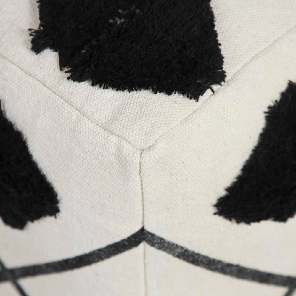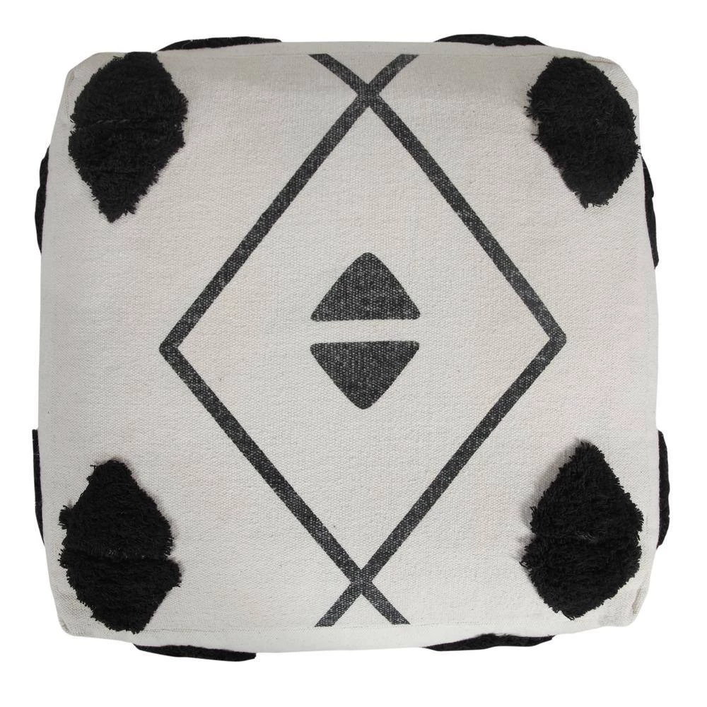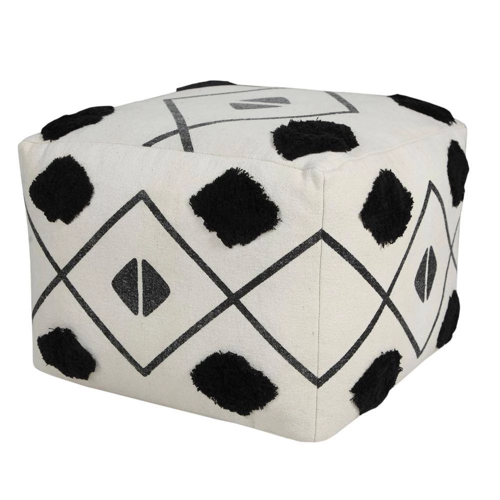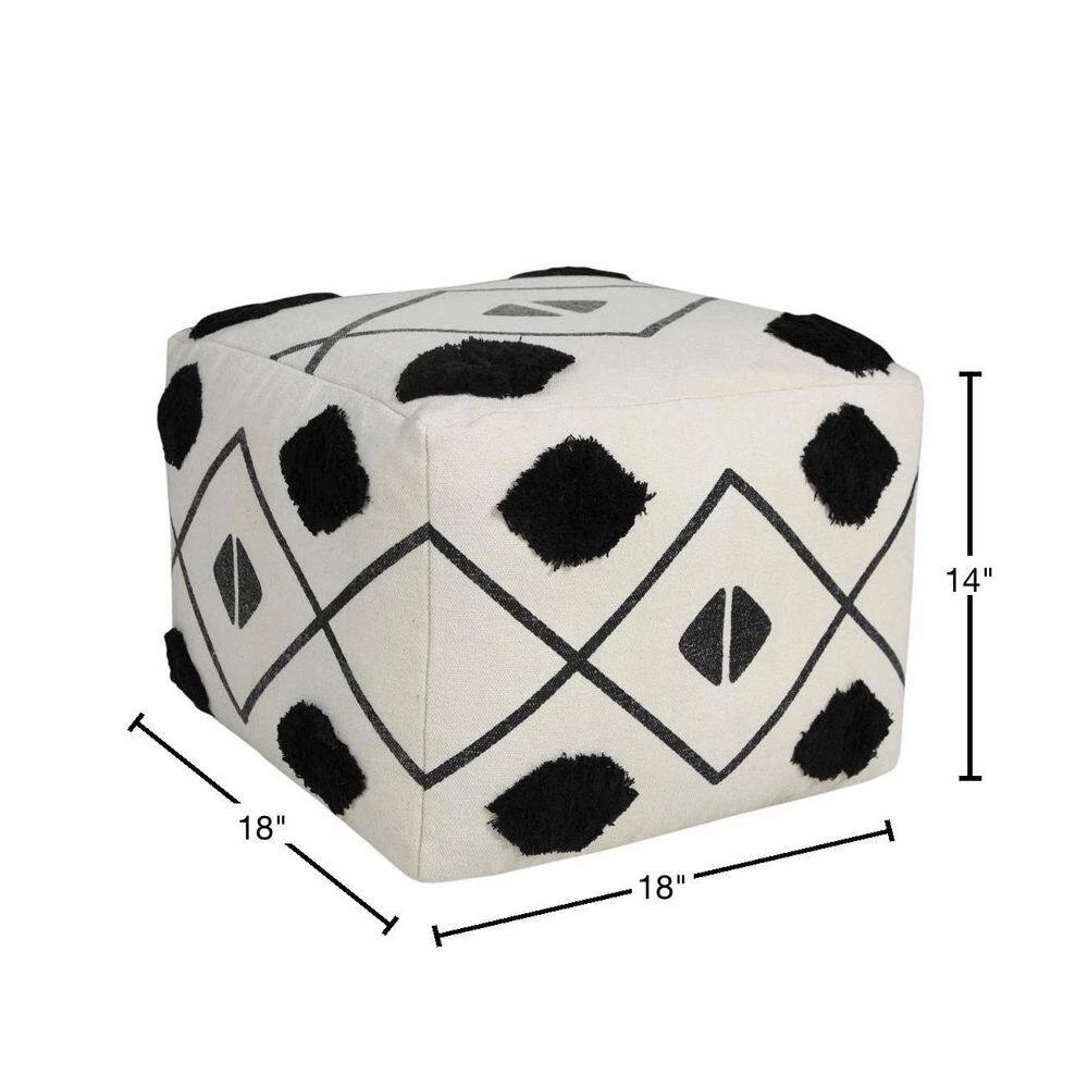 Textured Diamond Directional Pouf Ottoman, Black / White, 18 in. x 18 in. x 14 in. Providing form, function and fashion all in one charming package, this pouf features a mix of geometric designs to go with any style from contemporary to Scandinavian to boho. Combining classic black and white tones with an all-around diamond motif, this piece brings rich textured tufting and dynamic design into your space. Easily tucked away or toted to another room in your home, use this all-in-one object as an additional seat, footrest, stool, ottoman, side table or just stylish decor. The possibilities are endless.