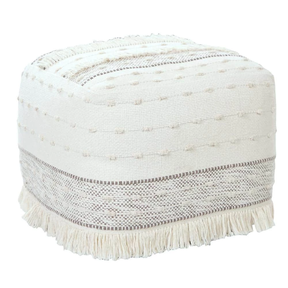 Providing form, function and fashion all in one charming package, this pouf features a neutral brown beige and ivory color palette with a subtle color block design to go with any style from farmhouse to transitional to country chic. Combining an irresistibly touchable texture with bordering shag fringe and all-around detailed dot dimension, this design brings out all the flair to breathe fresh style into your room. Easily tucked away or toted to another room in your home, use this all-in-one object as an additional seat, footrest, stool, ottoman, side table or just stylish decor. The possibilities are endless.