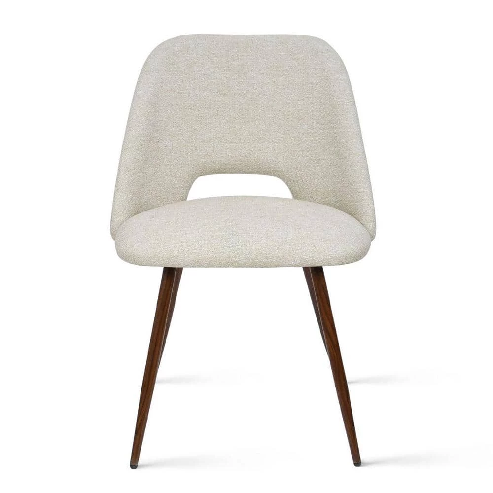 This simple and classic design never goes out of style.Wrapped in high-qualified fabric,the fabric is 375gsm, very thick and strong. The scoop-back shape gives this chair a smooth, streamlined silhouette and supportive sit. Snuggle in your seat and have a good dinner or meeting.The the legs are made with solid steel but in warm walnut texture. Assembles in second with only 4 screws.